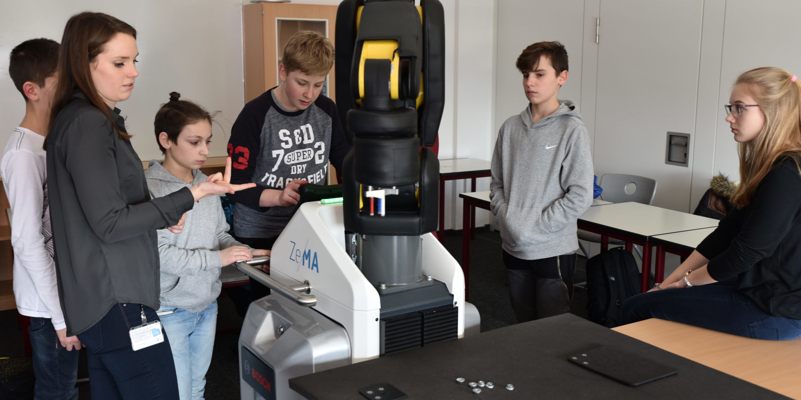Unter dem Arbeitstitel „Einführung in MRK-fähige Roboter-Systeme anhand von 3 Beispiel-Applikationen“ beschäftigten sich rund 30 Schüler der Klassenstufe 8 mit verschiedenen Roboter-Systemen und deren Sensorik. Während das ZeMA mit einem UR 3 und einem Bosch APAS zwei Roboter vorstellte, die bereits in der Industrie eingesetzt werden, stellte der Umwelt-Campus Birkenfeld (UCB) mit dem uArm einen Entwicklungs- und Schulungsroboter vor.