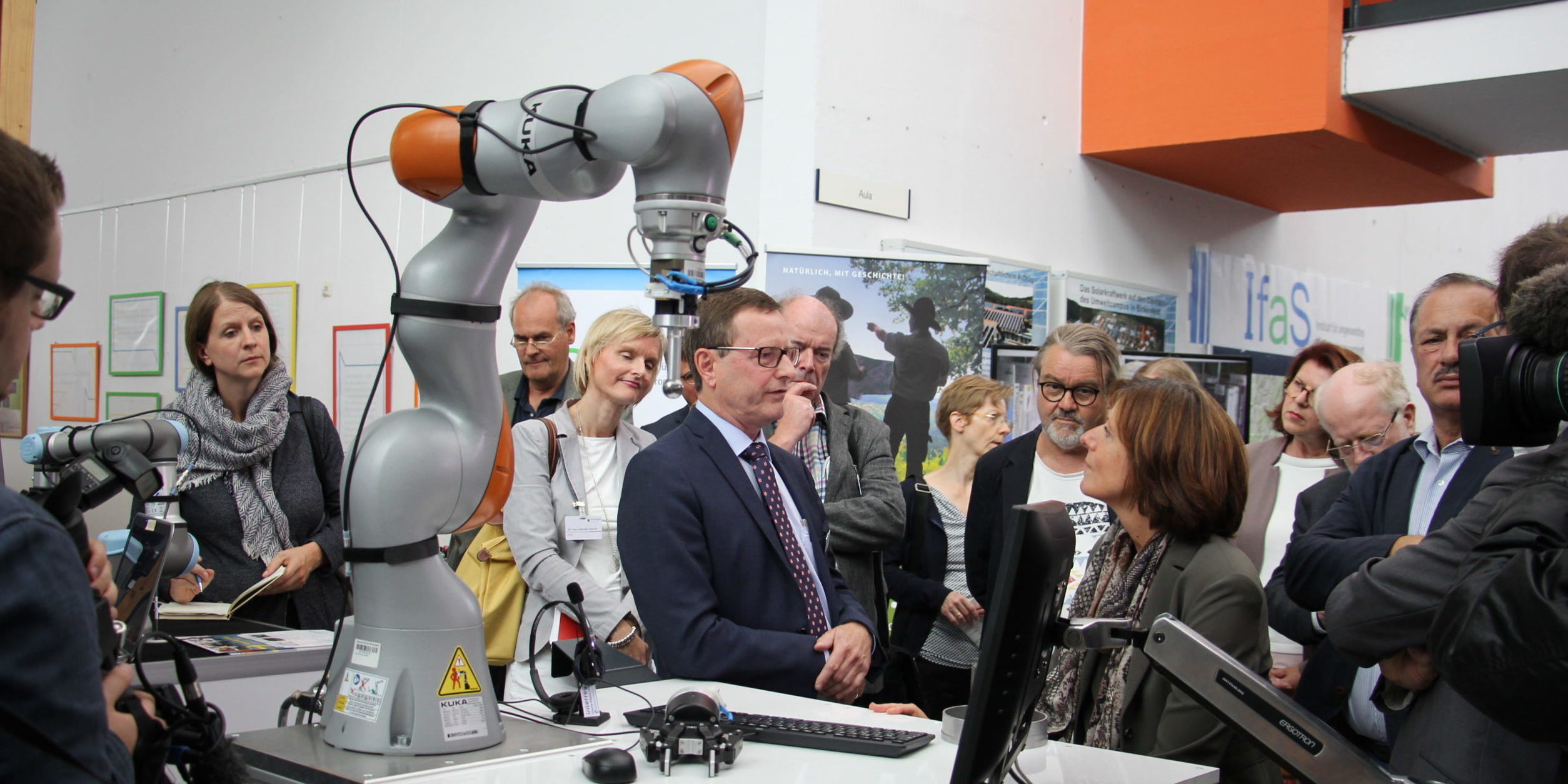 In diesem Zusammenhang konnte der Lehrstuhl Fachgebiet Robotik und Regelungstechnik von Prof. Dr.-Ing. Wolfgang Gerke den grenzüberschreitenden Forschungscluster „Robotix-Academy“ präsentieren. Neben einer allgemeinen Vorstellung des Interreg-Projektes wurden hier mehrere, am Umwelt-Campus Birkenfeld entwickelte, Roboter-Demonstratoren vorgeführt und erläutert.