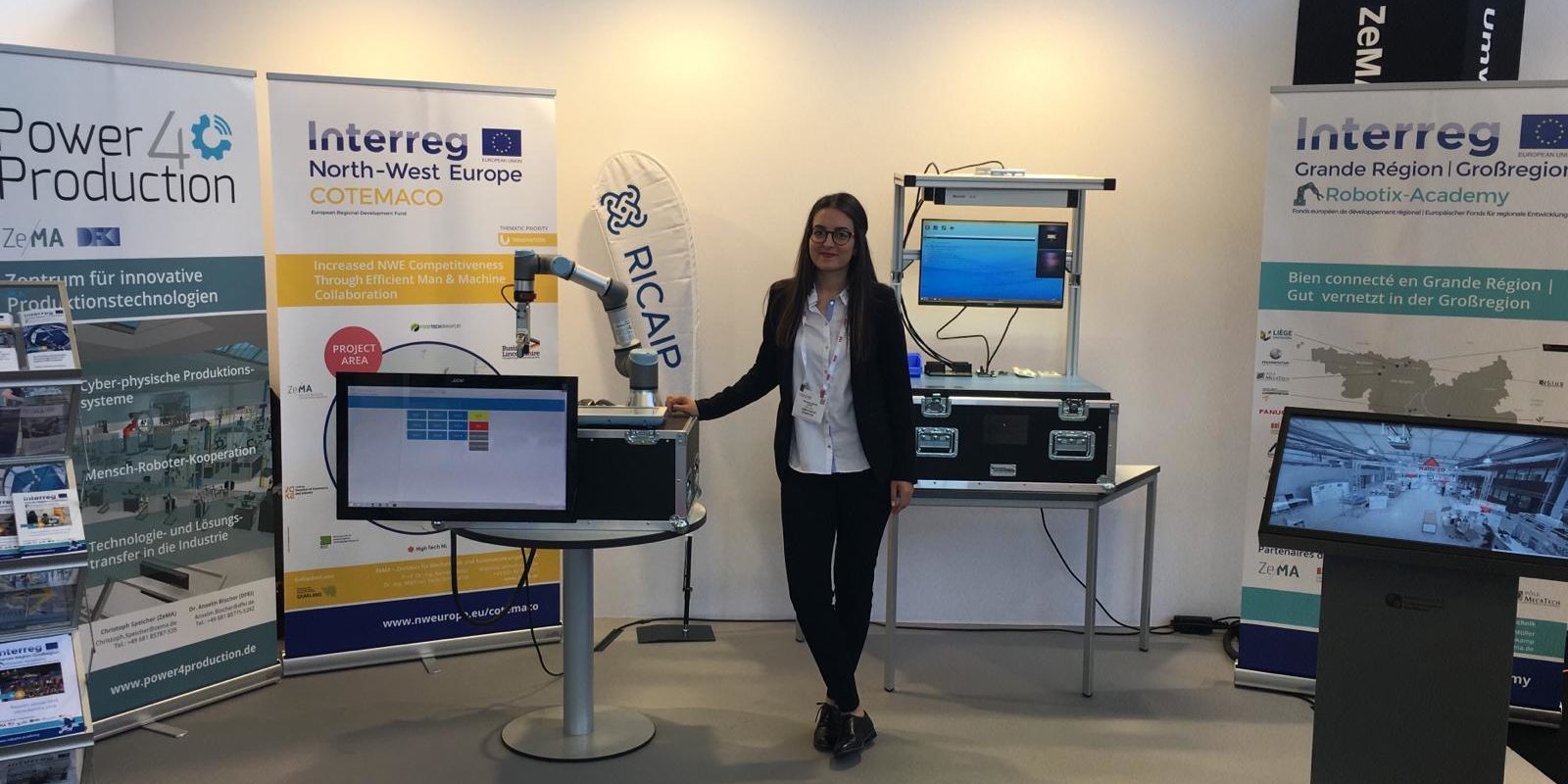 Für das ZeMA sind Fabian Adler und Khansa Rekik vor Ort, beide wissenschaftliche Mitarbeiter im Bereich Mensch-Technik-Interaktion. Sie forschen im Bereich teilautomatisierte Prozesse und konnten auf der ReMaTech ihre neueste Applikation vorstellen.