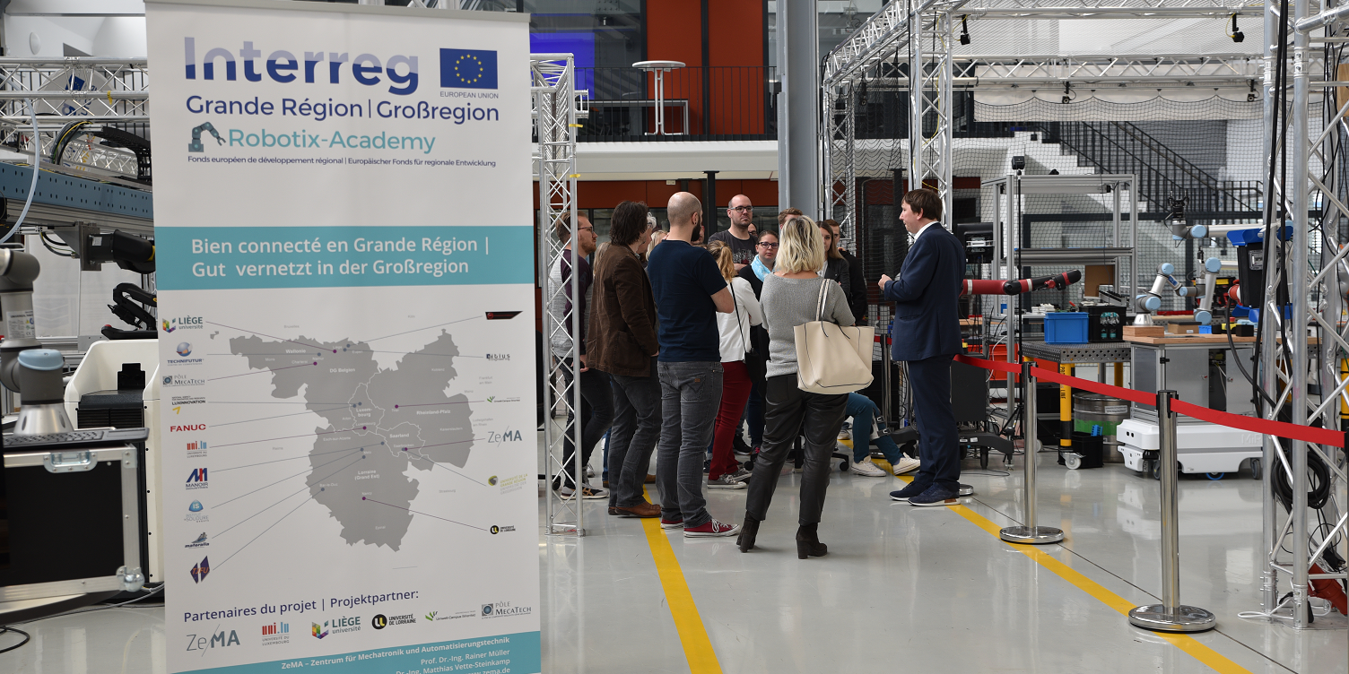 Le 26.04. l’Académie sarroise de cogestion ver.di a visité le centre ZeMA. Les participants au module de formation avancée de l’académie ont pu s’informer sur les dernières technologies I4.0 et la collaboration homme-robot. Après une brève introduction théorique, les visiteurs ont eu l’occasion de voir les derniers exemples d’application des projets Interreg Robotix-Academy et COTEMACO lors d’une démonstration pratique dans le nouveau hall ZeMA. Matthias Vette-Steinkamp, chef de groupe Robotique et Interaction Homme-Technologie, a accompagné le groupe et expliqué les différentes applications.