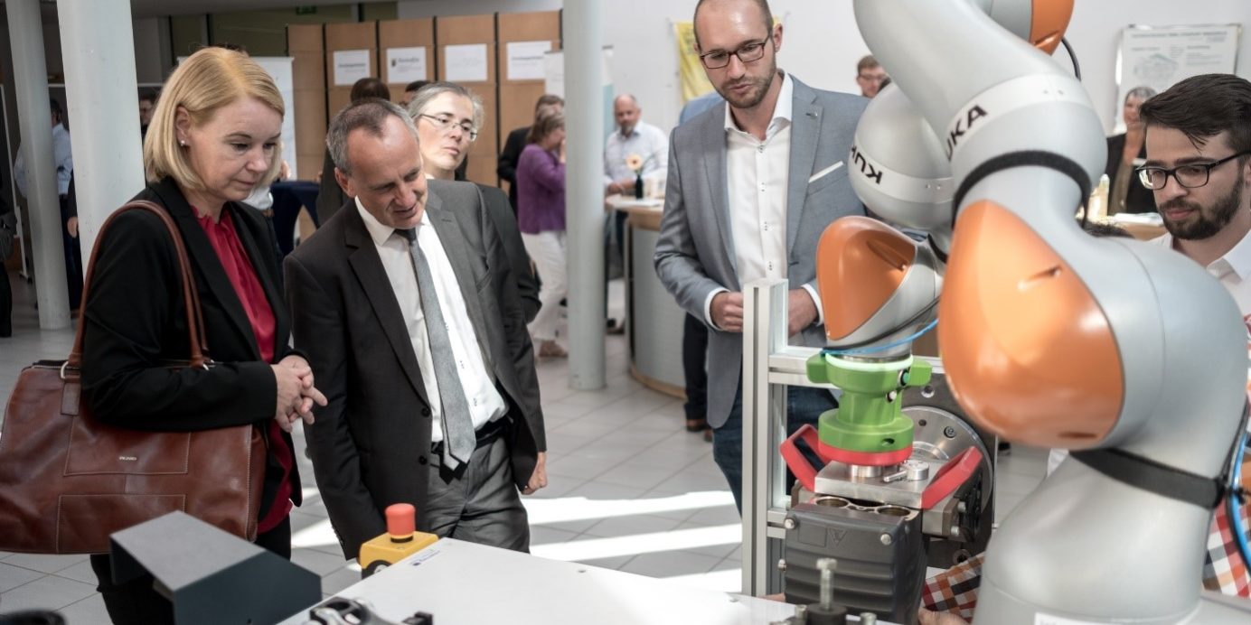 Le département “Robotique et technique de commande” sous la direction du professeur Wolfgang Gerke a présenté au ministre le cluster de recherche transfrontalier pour la robotique industrielle “Ro-botix-Academy”. Les assistants de recherche Sebastian Groß, Thomas Bartscherer, Florian Schäfer et Lukas Vogt étaient sur place et ont donné un aperçu du travail du pôle de recherche. Ils ont présenté un démonstrateur développé dans le cadre du projet, qui montre le démontage de motoréducteurs élec-triques dans le cadre d’un processus de reconditionnement.