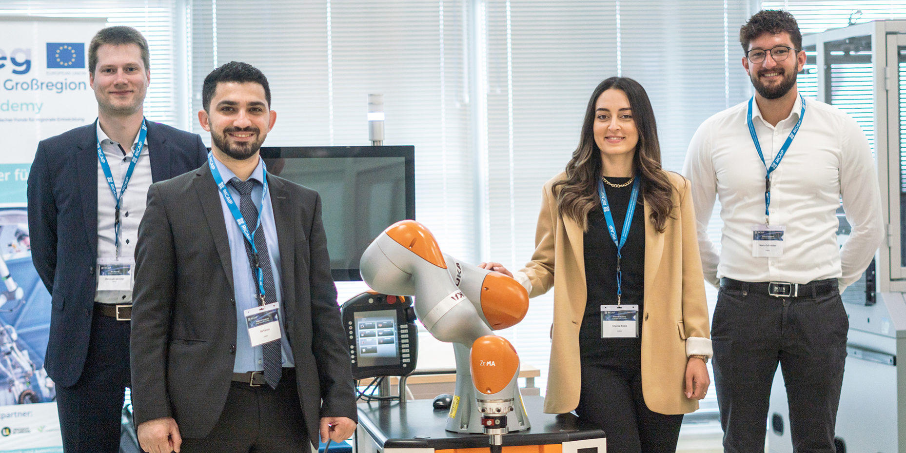 Dans ce cadre, la Robotix-Academy a donné une introduction aux systèmes robotiques HRC en mettant l’accent sur les systèmes assistés par la vision et les systèmes sensibles. Au cours de cet atelier spécial, l’équipe de la Robotix Academy du ZeMA, un partenaire du RICAIP, a présenté les dernières applications de la robotique industrielle à l’aide de démonstrateurs interactifs. Deux démonstrateurs sur les applications robotiques à commande par la force ainsi que sur les applications robotiques assistées par caméra étaient également sur place et ont permis d’entrer dans la HRC par des démonstrations en direct, des exposés et des discussions.